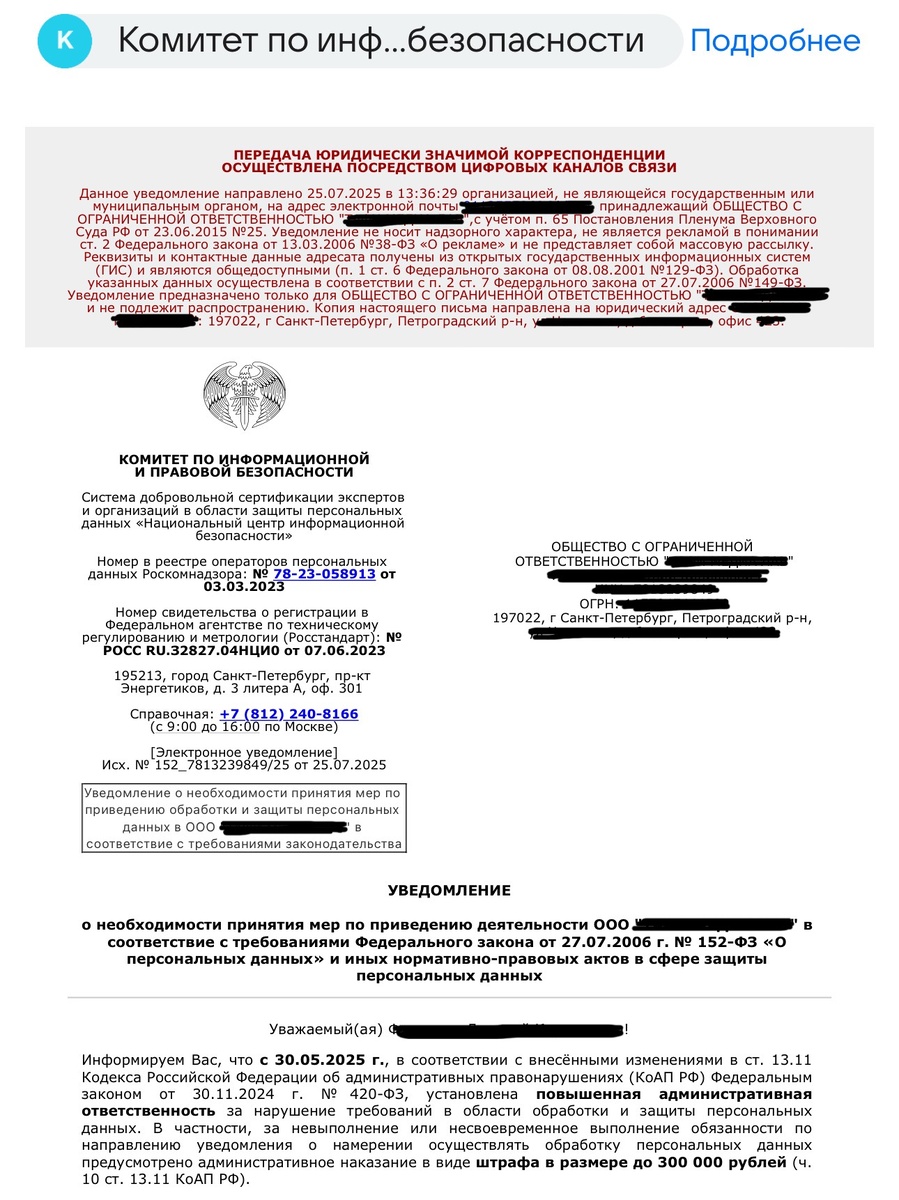 25 июля пришло письмо. Официальный тон, пугающие формулировки: «Нарушения закона №152-ФЗ», «проверка Роскомнадзора», «повышенная административная ответственность», «штраф до 300 тысяч рублей». А внизу внезапное предложение: пройти аудит за деньги.