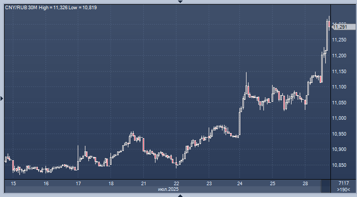 Трамп решил отрезать Россию от целого мира. Ослабление рубля будет выгодно бюджету и экспортерам Курс доллара к рублю расчётный, фьючерс, вечный фьючерс и межбанк. Курс евро к рублю расчётный, фьючерс, вечный фьючерс и межбанк. Курс юаня к рублю биржевой, фьючерс, вечный фьючерс и межбанк. В ходе торгов на Московской бирже в понедельник курс китайского юаня поднялся выше отметки в 11,3 рубля — впервые с 8 мая. Российский рубль в этот день продолжил снижение по отношению к основным мировым валютам. Это связано с несколькими факторами: снижение ключевой ставки ЦБ РФ на заседании 25 июля; заявления президента США Дональда Трампа о возможных санкциях против России; окончание налогового периода в июле. Президент США Дональд Трамп заявил, что новые санкции против России могут быть введены уже через 10–12 дней. Ранее он говорил о 50 днях. «Я установлю новый срок — примерно на 10 или 12 дней, начиная с сегодняшнего дня. Нет причин ждать», — сказал Трамп на встрече с премьер-министром Великобри