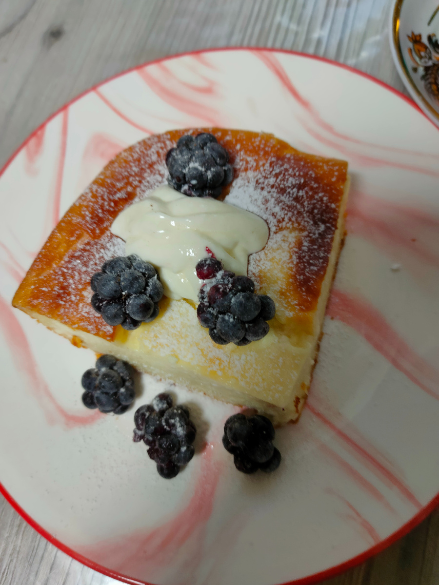 На завтрак у нас сегодня творожная запеканка на йогурте. Ела ее со сметаной и ежевикой.