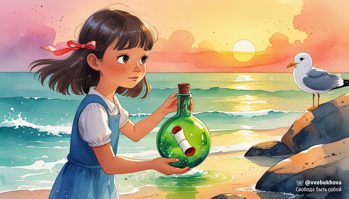 Бризвиль, Дикий пряж, 28 июля Мы сидели с тётей Элей на веранде и пили мятный чай. Слушали, как вечерний бриз перелистывает страницы дневника. До конца июля осталось всего несколько дней, и эта мысль висела в воздухе — тихая и немного грустная. — Летние истории похожи на медуз, — сказала она, ловя ложкой ускользающую дольку лимона. — Прозрачные, невесомые и... опасные, если пытаться удержать. Она исчезла в мастерской и вернулась с бутылкой — пузатой, цвета морской глубины, с неровным горлышком, будто её когда-то откупоривали зубами. И старый, пожелтевший лист бумаги. — Ну что, летописец, — вдруг спросила тётя. — Книга почти дописана. А что потом? Я не знала, что ответить. Все мысли о будущем казались далёкими и нереальными. — А что, если не строить планы? — сказала тётя. — Что, если просто отправить в будущее весточку о себе? Рассказать той, будущей Лоре, какая ты сейчас. Задать ей вопросы? Море — лучший почтальон, — подмигнула она. — Доставляет письма не по адресу, а по времени. Взяла