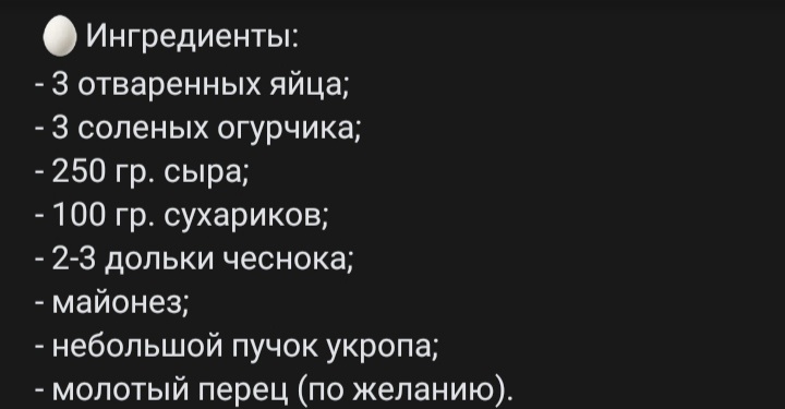 Вкусный , лёгкий в приготовлении да и покушать тоже . Рецепт нашла в ВК подписана на разные группы с рецептами и от туда и беру вкусные рецепты . Решила попробовать и этот салатик кстати каждый раз делаю и пробую новинки но как праздник вечно думаю какой же приготовить и делаю Цезарь либо Греческий 🤭🥗 а в будни разные салаты . Рецептик Сыр натерла на крупной тёрке Огурец взяла свежий и настругала брусочками ( возможно с солёнными огурцами был бы более вкуснее не знаю не стала открывать банку с огурцами когда свежии есть с грядки ). Зелень взяла укроп и листья салата , и даже базилик и всё мелко нарезать ну абы не крупно . Дальше яйца тоже измельчить с чесноком (под прэс можно чеснок.). Дальше идут сухарики . Можно купить а можно и самим обжарить хлеб специями но я взяла Аля сухарики Бульба там картошка нарезана соломкой . Короче вкусней чем эти сухарики но а если самим приготовить сухарики - это капец как вкусно . Пасыпала перцем черным и заправила майонезом . Вкусный