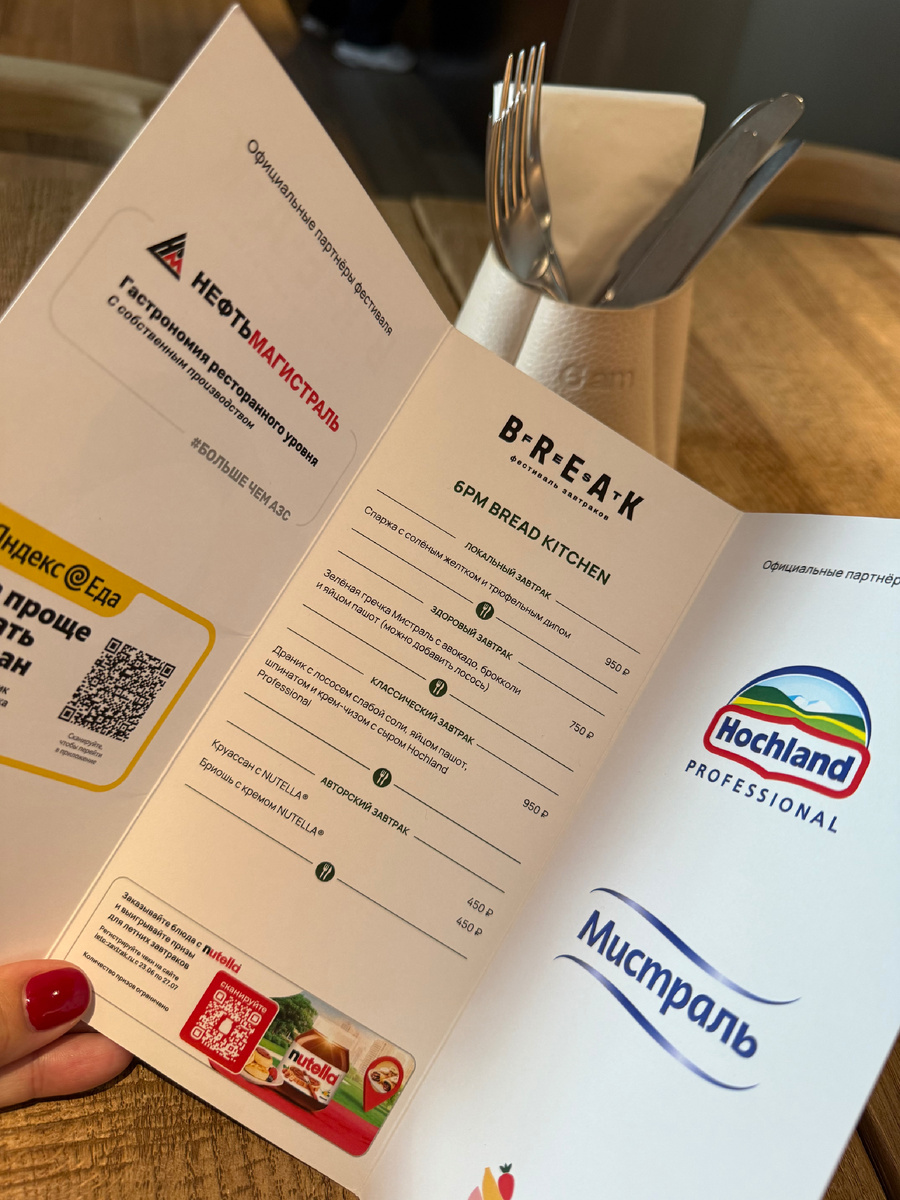9-ый всероссийский фестиваль BreakFest #фестивальзавтраковbreakfest в 6pm Bread Kitchen Меню фестиваля завтраков ЛОКАЛЬНЫЙ ЗАВТРАК Спаржа с солёным желтком и трюфельным дипом 950₽ ЗДОРОВЫЙ ЗАВТРАК Зелёная гречка Мистраль с авокадо, брокколи и яйцом пашот (можно добавить лосось) 750₽ КЛАССИЧЕСКИЙ ЗАВТРАК Драник с лососем слабой соли, яйцом пашот, шпинатом и крем-чизом с сыром Hochland Professional 950₽ АВТОРСКИЙ ЗАВТРАК Круассан с NUTELLA® 450₽ Бриошь с кремом NUTELLA® 450₽ _______________________ ✍🏻Официальный сайт фестиваля. ✍🏻Дзен канал фестиваля ✍🏻Официальными партнерами 9-ого всероссийского фестиваля BreakFest 2025 выступают: ✔️Сервис бронирования столиков в ресторанах “Куда сходить” от Яндекс ЕДА ✔️Крупнейшая в России компания, занимающаяся высококачественным производством круп - МИСТРАЛЬ. ✔️Эксперт в сырах для профессионалов и ведущий производитель сыра в Европе - HOCHLAND PROFESSIONAL ✔️ Крупная оптово-розничная топливная Компания, торговый дом Нефтьмагистраль.