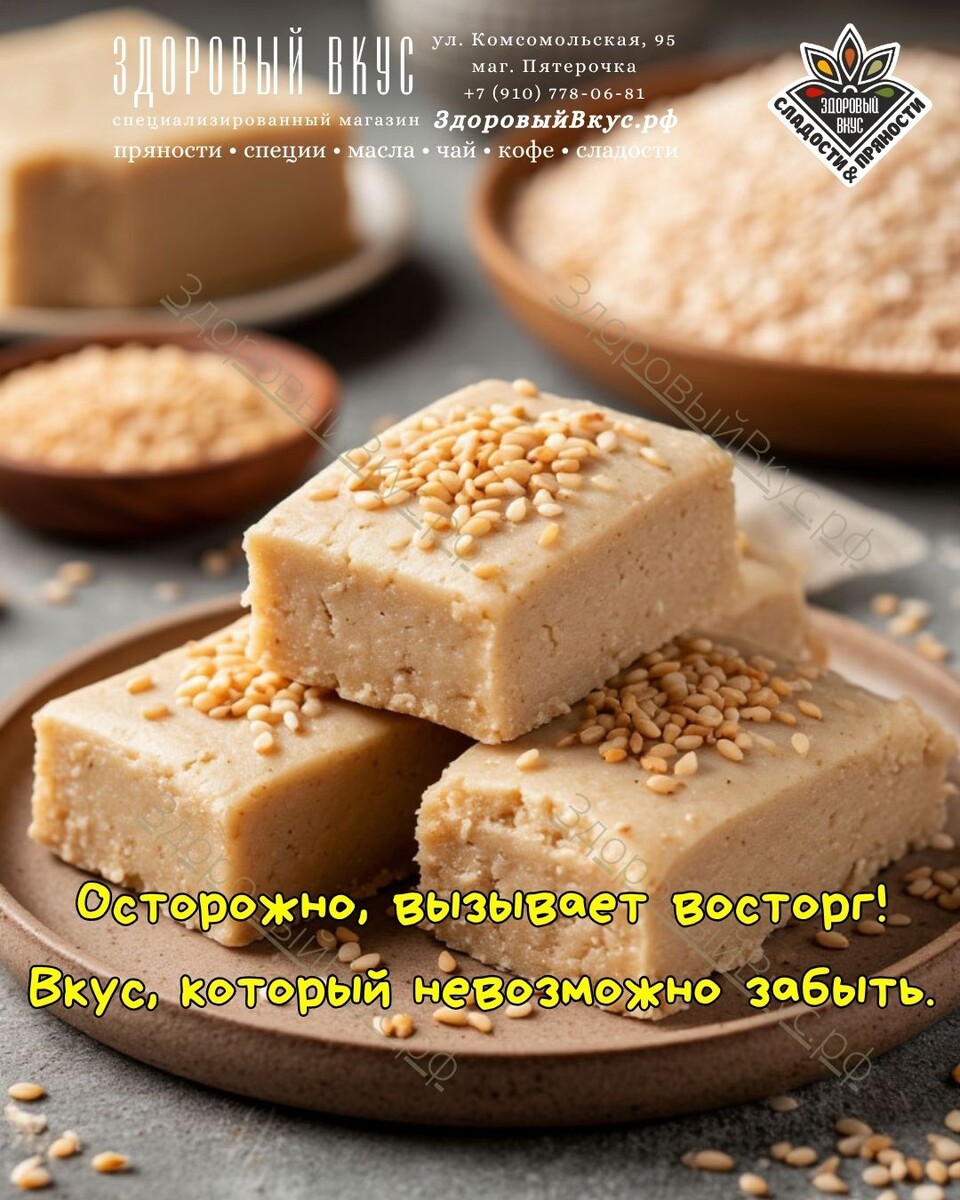 🌿🍯 Почему тахинная халва — настоящая находка для любителей сладкого? Ах, эта волшебная смесь сладости и легкости! Если вы любите экспериментировать с новыми вкусами и ищите идеальный баланс между удовольствием и пользой, тахинная халва обязательно должна стать частью вашего гастрономического путешествия. 🍰 Тахинная халва — это разновидность восточной сладости, приготовленной из 🌱семян кунжута🌱. Ее отличительная особенность — легкий оттенок сероватого цвета и неповторимый вкус, который сочетает в себе приятную сладость и едва заметную горчинку. Эта халва обладает мягкой структурой и легко ломается на волокна, что делает ее идеальной для наслаждения каждым кусочком. 😍 Тахинная халва представляет собой настоящую кладезь питательных веществ и витаминов, что делает ее не только вкусным, но и полезным продуктом. Вот некоторые ключевые аспекты ее пользы: 1️⃣ Питательные вещества Тахинная халва богата важными микроэлементами и витаминами, необходимыми организму: - Кальций: Укрепляет зубы