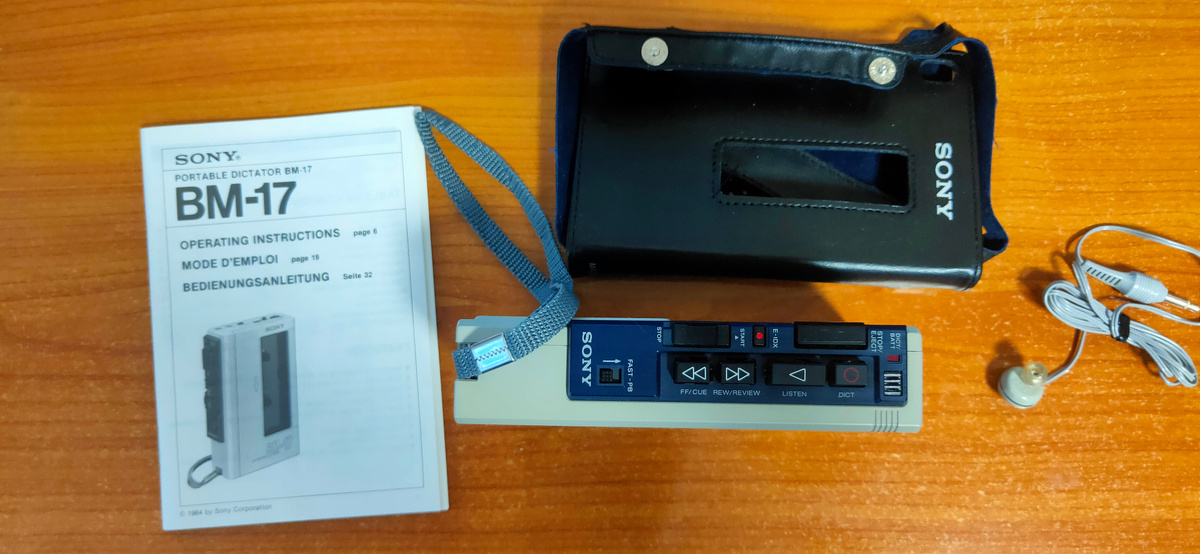 Эх, поторопился я от него избавиться, хотя мог бы получше изучить его инструкцию, которую в Интернете потом не нашел. А это был довольно интересный аппарат, полное название которого - Sony BM-17 Dictator. Смотрим родную комплектацию - чехол, диктофон, инструкция и монофонический наушник. Наушник ближе. Судя по инструкции, мой экземпляр был где-то из этого времени. Состояние самого диктофона - новое. Ни царапинки, ничего нет, прям недавно куплен в 1984-м. Питался от 2-х батареек типа АА... ...но, мог и от сети с родным блоком питания, который в комплект видимо не входил. Конечно, он имеет свой штатный динамик. Тут хороший набор функций - пауза, перемотки в обе стороны, причем, можно мотать и со звуком при включенном воспроизведении. Так же имеется ускоренное воспроизведение с частотной коррекцией и встроенный микрофон. Тут всё понятно, но есть еще переключатель чувствительности микрофона. Думал, сейчас вставлю кассету и послушаю саунд диктофона 80-х, но нет. Что-то с пассиком видать слу