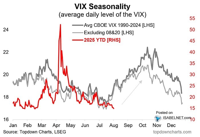 VIX уже вернулся к уровню февраля 2025-го, показывая экстремальное спокойствие как в прошлом году перед carry trade unwind обвалом — рынки слепы к рискам инфляции от тарифов и слабости глобальной экономики, а отчеты техов могут подтвердить завышенные оценку ИИ-акций.