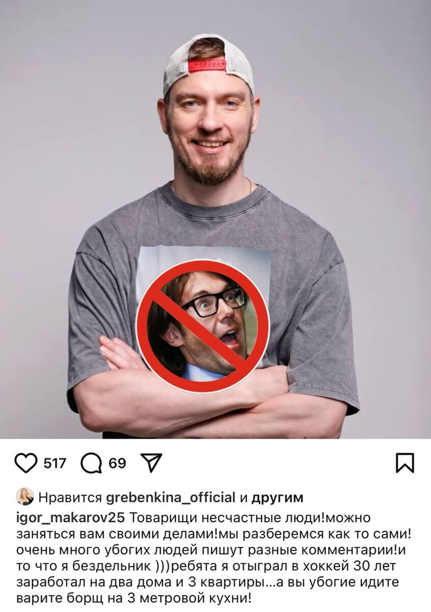 Пока еще муж Леры Кудрявцевой разразился гневной отповедью в адрес критиков, назвав их «убогими» и «несчастными». Себя же экс-хоккеист Игорь Макаров считает преуспевающим человеком, заработавшим на 2 дома и 3 квартиры, а вовсе не забулдыгой-алкоголиком