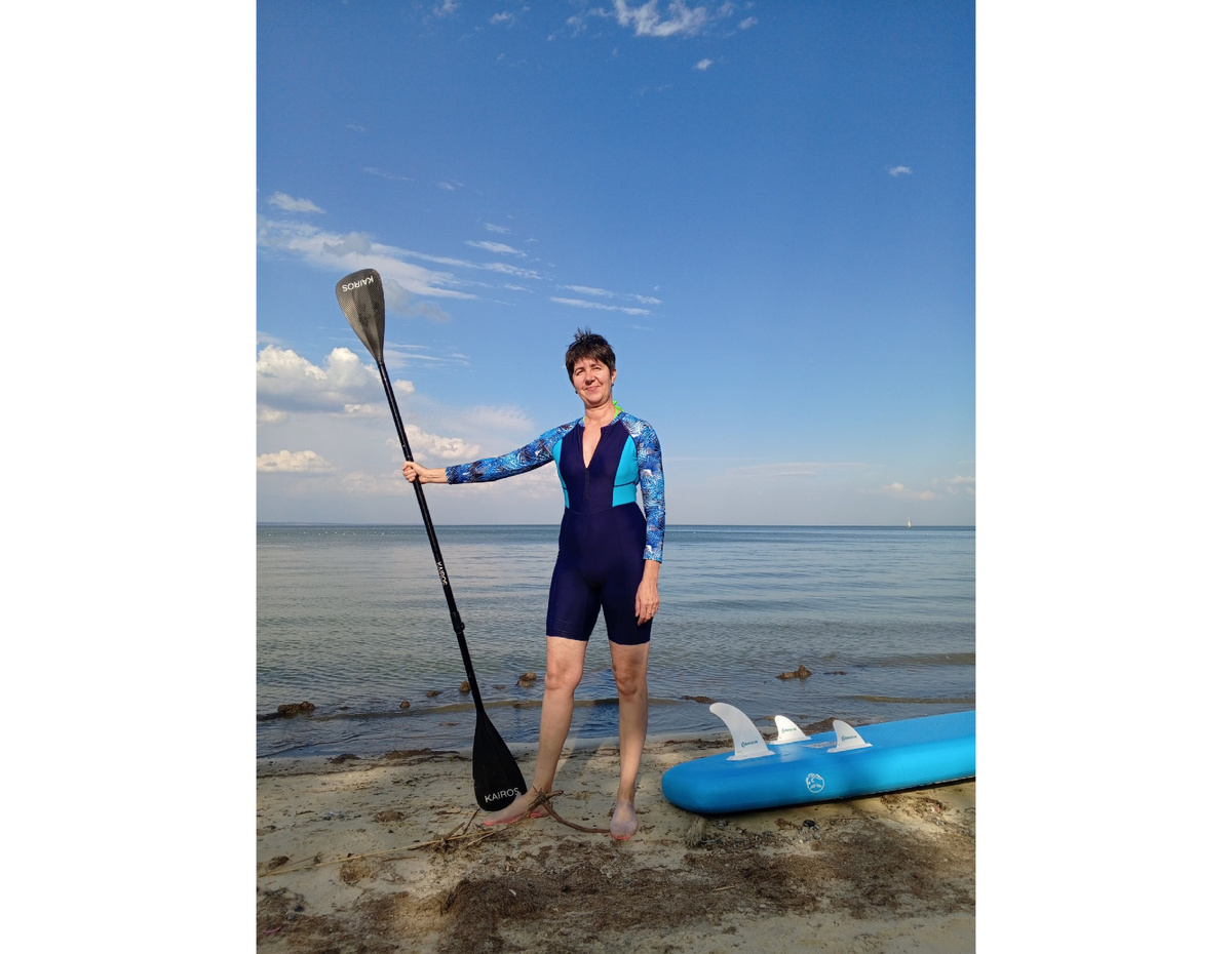 Стоя плавать на сапборде мы пока так и не научились, не было возможности потренироваться на спокойной воде, а баланс на волнах не удержать. Поэтому наслаждаемся водной стихией пока только на коленях, либо сидя. Хотя в таком положении однолопастным веслом, которое шло в комплекте, управлять не очень удобно. Решение созрело само собой: нужно двулопастное байдарочное весло! И вот оно, долгожданное приобретение, легкое и сбалансированное в руках. Состоит из трех секций. Его также можно переделать на однолопастное. А еще оно не тонет, что является большим плюсом. И мы тут же рванули его опробовать. Поехали после работы на набережную. Погода прекрасная: ласковый ветерок, на воде небольшая рябь, солнце пригревает, но не палит. Просто идеальный баланс между теплом и свежестью. Накачали доску, спустили на воду и опробовали наше новенькое весло. Сап послушно летит вперед, скользя по воде легко и резво. Теперь не нужно совершать никаких лишних телодвижений. Весло с одной лопастью, приходилось