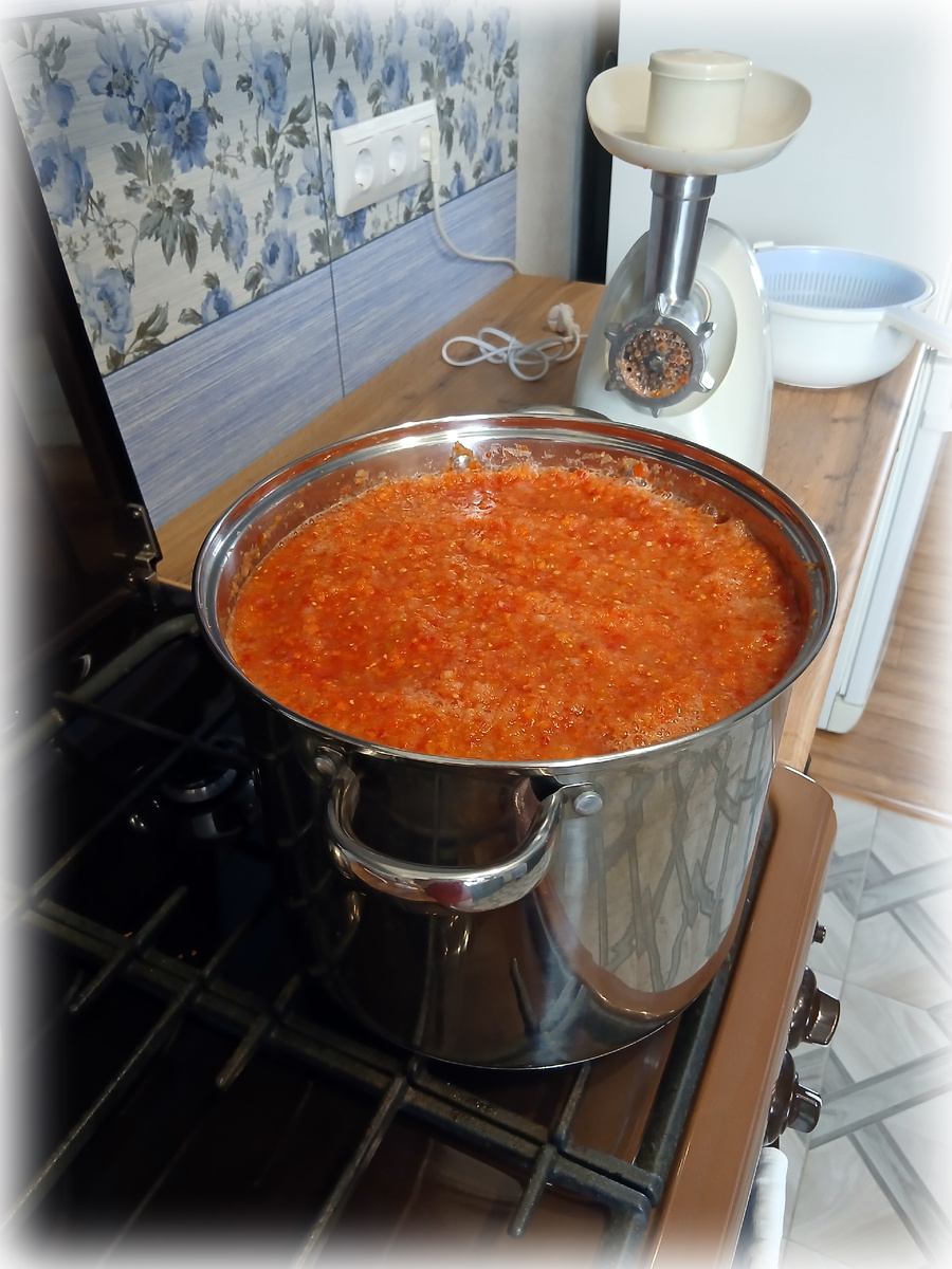 Всем привет! 👋 Пора консервации продолжается. Мы много экспериментировали с аджикой. В разное время добавляли в рецепт яблоки, кабачки, сливы... 🙄 Но нет! Самая вкусная аджика получается по самому простому, можно сказать - классическому, рецепту: помидоры - 2,5 кг; морковь - 500 гр; перец болгарский - 500 гр; лук репчатый - 300 гр; чеснок - 200 гр; перец горький - 3 шт.; сахар - 1 стакан; соль - 1/4 стакана; масло растительное - 80 мл; уксус 9% - 80 мл. Все овощи пропустить через мясорубку. После закипания добавить сахар и соль, варить на медленном огне 30 мин. Добавить масло и уксус. Варить ещё 2 часа, периодически помешивая. В мою 11-литровую кастрюлю помещается порция в 2,5 раза больше: Аджика сильно уваривается. Из моей х2,5 порции ингредиентов получилось ровно 7 литров (14 пол-литровых баночек): Приятного аппетита! Пишите комментарии, ставьте 👍, подписывайтесь на канал, чтобы не пропустить новые публикации! Спасибо за внимание!