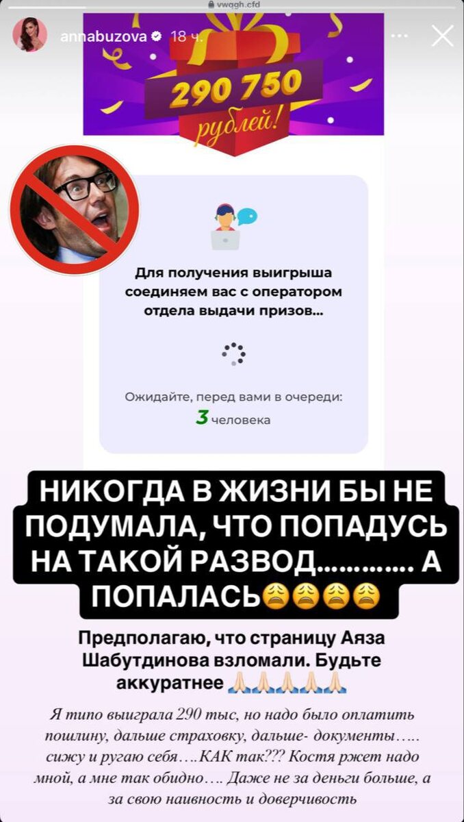 А мы всё гадали, что за люди покупают курсы инфоцыган. Вот, пожалуйста. Сестра Бузовой приняла участие в конкурсе от сидящего в СИЗО за мошенничество Аяза Шабутдинова. То есть даже тюрьма её не смутила. Конкурс тем временем оказался разводкой. Мошенника Аяза взломали другие мошенники. Анне Бузовой пообещали 290 тысяч, только сначала надо было оплатить пошлину, страховку, документы…