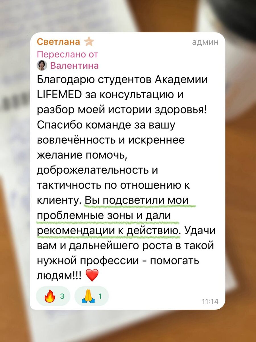 📝Вести с учебных полей Пару недель назад мы уже закончили изучение всех основ нутрициологии и питания в целом. Это значит, что уже сейчас у меня есть абсолютно все знания и компетенция помогать людям в организации сбалансированного питания с учётом их потребностей и особенностей. А в данный момент мы активно постигаем азы непосредственно практики и консультирования 😉 На фото 🔼отзыв о консультации, которую мы проводили в нашей мини-группе для получения опыта) Ещё совсем немного подготовки, практики и с 11 августа уже будем сдавать экзамены, после которых я получу настоящий диплом нутрициолога 🤗 Даже не верится, что это обучение подходит к завершению 🥲