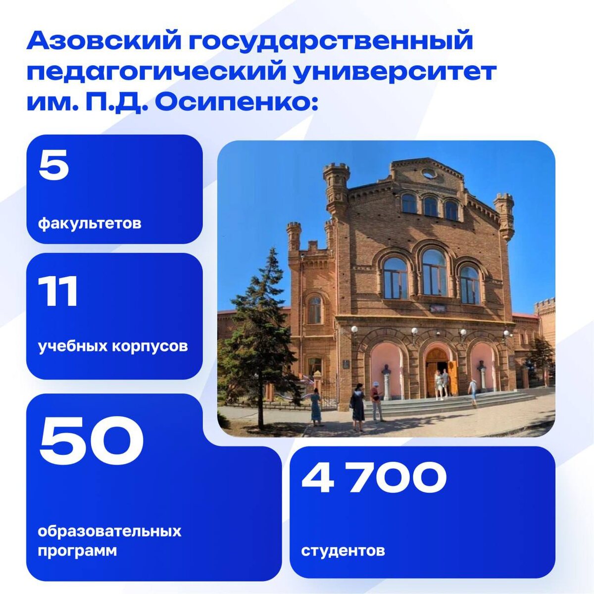 Азовский государственный педагогический университет им. П.Д. Осипенко — инновационная площадка для формирования новой модели образования в Запорожской области. В АГПУ осуществляется подготовка профессионалов, которые имеют новаторское мышление, обладают высоким уровнем компетентности и способны выражать свою гражданскую позицию. ✔️ Подробнее о вузе и новых программах этого года читайте в карточках.