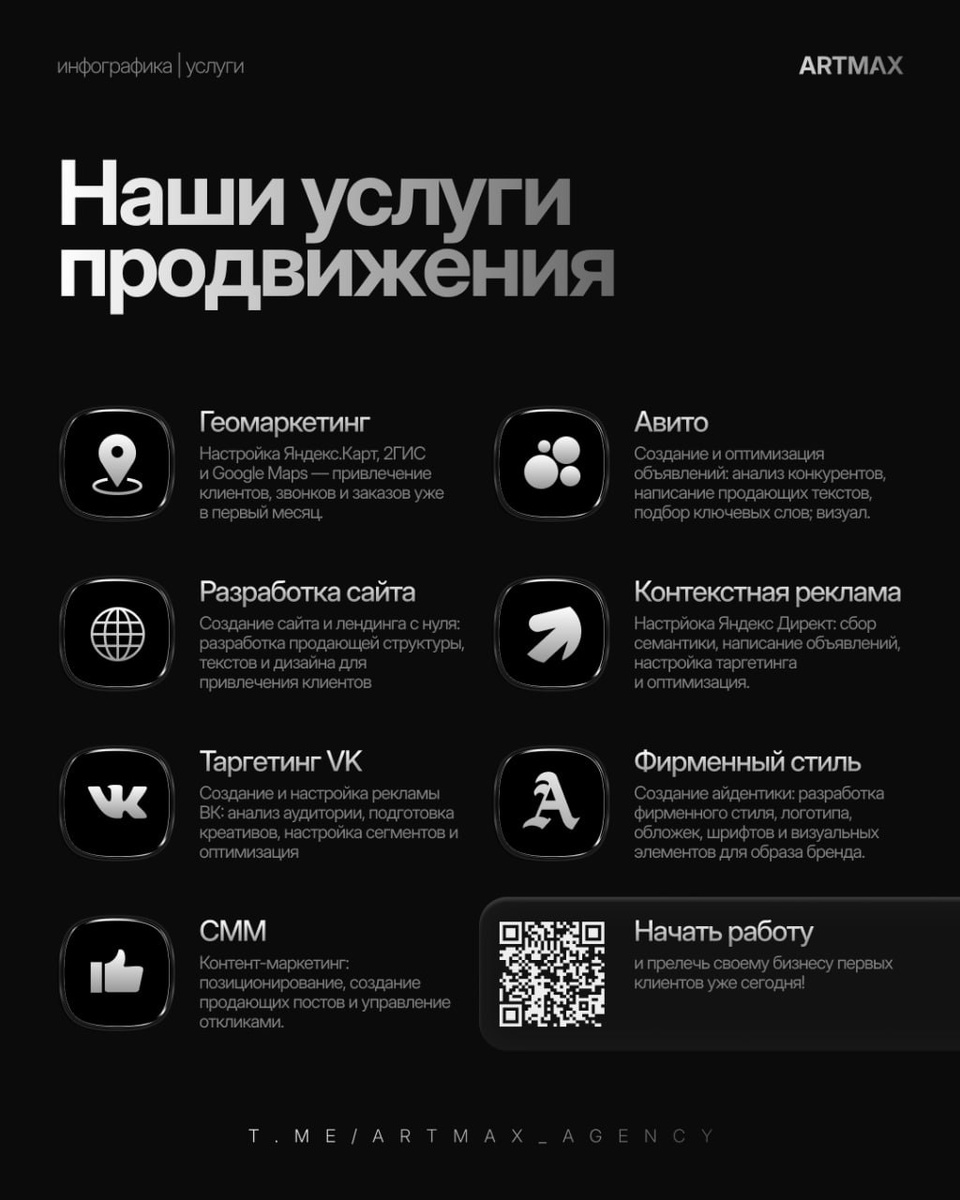 🔴 КАК МЫ ДЕЛАЕМ БИЗНЕС ВИДИМЫМ И ПРИБЫЛЬНЫМ В России десятки тысяч компаний с хорошими продуктами и услугами, но большинство из них остаётся незамеченным. Проблема не в качестве, а в том, что клиенты их просто не видят. 🧰 Мы решаем эту проблему тем, что: — Выводим компании в топ Яндекс.Карт и 2ГИС. Чем выше вы в выдаче, тем больше реальных клиентов. — Создаём сайты и лендинги, которые продают. Не красивые «визитки», а продуманные страницы с акцентом на конверсию: цепляющие заголовки, чёткие офферы, удобный путь до покупки. — Настраиваем рекламу, которая окупается. Рекламу в яндексе и вконтакте мы делаем под конкретную цель — не ради кликов, а ради продаж. — Превращаем обычные объявления на Авито в инструмент стабильных продаж — всё от упаковки до аналитики. — Упаковываем бренд. Дизайн, который вызывает доверие, формирует правильное восприятие и поднимает ценность продукта в глазах клиентов. Наши результаты: магазин антиквариата удвоил продажи после одного месяца работы с нами