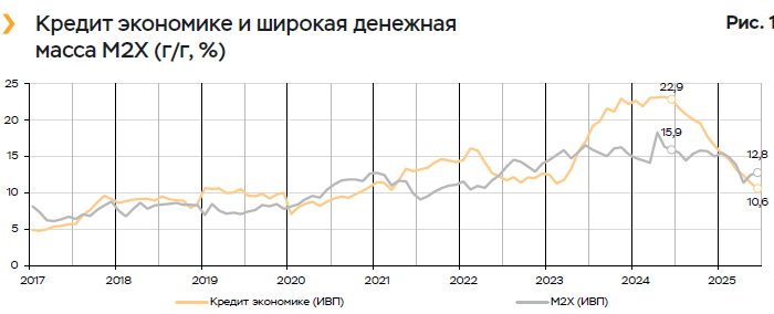 В июне темпы роста кредитования экономики замедлились до 0,3% м/м с майских 1,1% м/м, говорится в обзоре Банка России «Кредит экономике и денежная масса». Источник: Банк России Жесткая денежно-кредитная политика продолжает ограничивать кредитование в РФ, говорится в обзоре Банка России «Кредит экономике и денежная масса». В частности, в июне темпы роста кредитования экономики замедлились до 0,3% м/м с майских 1,1% м/м. На этом фоне годовой темп прироста показателя замедлился до 10,6%, что является самым низким значением с середины 2021 года. «Кредитование населения существенно замедлилось. Июньский прирост требований к населению составил менее 0,1%, за год требования банков к населению почти не изменились», — говорится в материале. — «Весь рост кредита экономике обеспечивали требования к организациям, за июнь возросшие на 0,4% против 1,4% месяцем ранее. Наибольший вклад в июньский прирост требований вносили рублевые кредиты и облигации. Как и в мае, рост кредитного портфеля банков обес