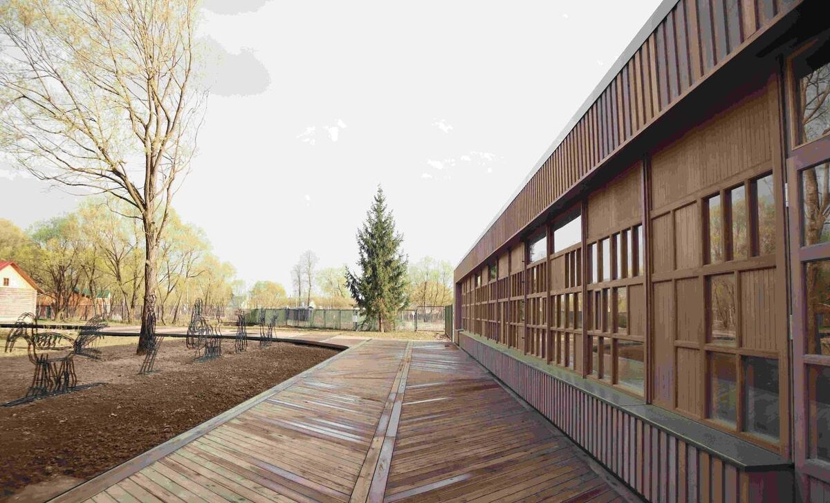 Визит-центр Музея-Заповедника А.П. Чехова «Мелихово» в Московской области. Это работа победителей VI Российского смотра-конкурса с международным участием «Дерево в архитектуре». За неё команда АБ «Рождественка» получила Гран-при и Золотой диплом в номинации «Общественное сооружение» в разделе «Постройки». Проектируемое здание представляет собой входной павильон, через который посетитель попадает на территорию Музея-заповедника. Объект расположен в юго-западной части участка, на территории зоны разрешённого строительства. Он располагается максимально близко к историческому въезду через Сиреневую аллею. Проектом предусмотрено изменение существующих сценариев восприятия территории и воссоздание исторических. «Архитектурное решение фасада здания с входной стороны олицетворяет концепцию максимального невмешательства в историческую среду. Длинный фасад, выполненный из доски лиственницы, расположенной внахлёст с небольшими оконными проёмами, концептуально продолжает деревянный забор. Од
