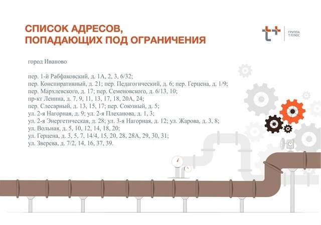 Крупный район города Иванова на день останется без горячей воды В Иванове завершаются работы по техническому перевооружению магистральных тепловых сетей в районе улиц Кузнецова и Вольной. В связи с этим 29 июля с 4:00 до 23:00 будет прекращена подача горячей воды по адресам, указанным на карточках.