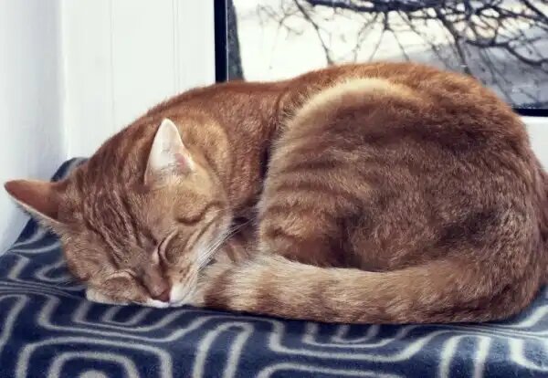 Самая распространенная поза — свернуться калачиком, спрятав нос под хвост. Так они сохраняют тепло и защищают самые уязвимые части тела. Эта поза говорит о том, что кошка чувствует себя в безопасности, но готова быстро среагировать на изменения.