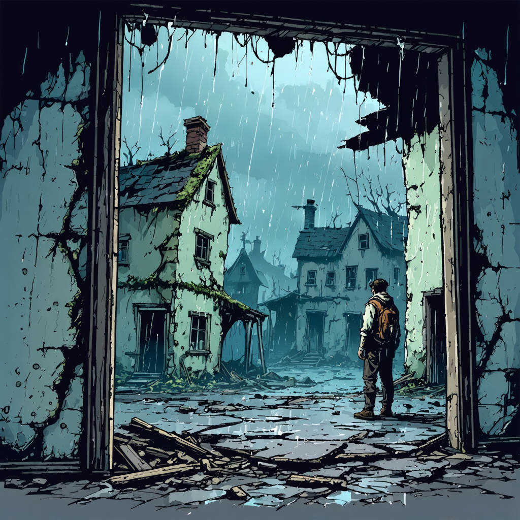 Ему нужно было найти укрытие — целый дом, где можно было бы не просто укрыться, а согреться и переждать дождь. Влад быстро оглядывался, глаза скользили по разрушенным зданиям. В одном из них дверь оказалась открыта, и, не раздумывая, он шагнул внутрь. Здание, к которому он подошёл, было словно обрученным временем. Крепкие кирпичные стены, покрытые трещинами, стояли стойко, как забытые свидетели былых дней. Крыша давно обрушилась, оставив лишь скелет из сгнивших балок и обломков. Но, несмотря на разрушения, структура всё ещё сохраняла свою прочность, как старый корабль, стоящий на мели, готовый удержаться на плаву. Через разбитые окна в полумрак проникал тусклый свет, а сквозь разорванную крышу в воздухе висел запах мокрой земли, плесени. Внутри было тихо, но эта тишина была напряжённой, словно сама руина ждала, чтобы её нарушил чей-то шаг.