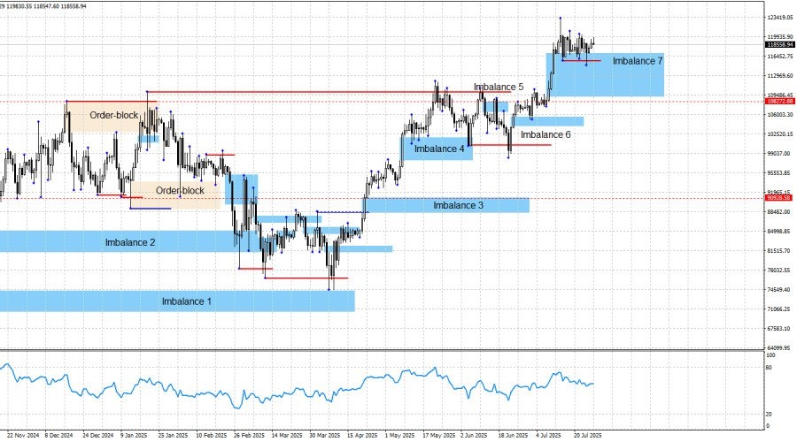 https://basechop.ru/wordpress/?p=51385 Добрый день, уважаемые трейдеры! Биткоин продолжает формирование «бычьей» структуры тренда и с 8 июля вырос на 13000$. После этого начался боковик, в котором криптовалюта находится уже несколько недель. Если падение котировок в виде коррекционного отката и начнется, то в любом случае не будет означать, что «бычий» тренд завершен. А последние движения биткоина указывают на практически полное отсутствие медведей на рынке. В ходе движения от 108000$ до 123000$ несколько дней подряд цена буквально летела вверх, и теперь эта область является одним большим имбалансом (7). Имбалансом не самым привлекательным, так как обычно такой паттерн состоит из трех свечей, а не из пяти. В любой точке этого имбаланса может быть выполнен разворот вверх, но, так как имбаланс очень широкий, внутри него может случиться несколько ложных разворотов и сломов структуры на младших графиках. Таким образом, я считаю, что нужно внутри этого имбаланса выделить наиболее вероятны