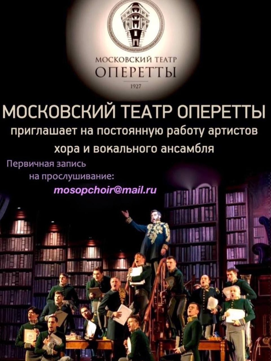 Открыты 2 вакансии в партиях теноров и альтов. На почту mosopchoir@mail.ru просьба присылать резюме, содержащие следующие сведения: -ФИО -контактный номер телефона -возраст -образование -тембр голоса (тенор, бас, меццо-сопрано, сопрано) -рост -вес -фото Предпочтителен возраст кандидатов до 30 лет и наличие высшего музыкального, либо высшего музыкально-театрального образования. Резюме, содержащие неполные сведения, рассмотрены не будут. Прослушивание кандидатов состоится в сентябре 2025 года. Дата и время прослушивания будут объявлены отдельно.