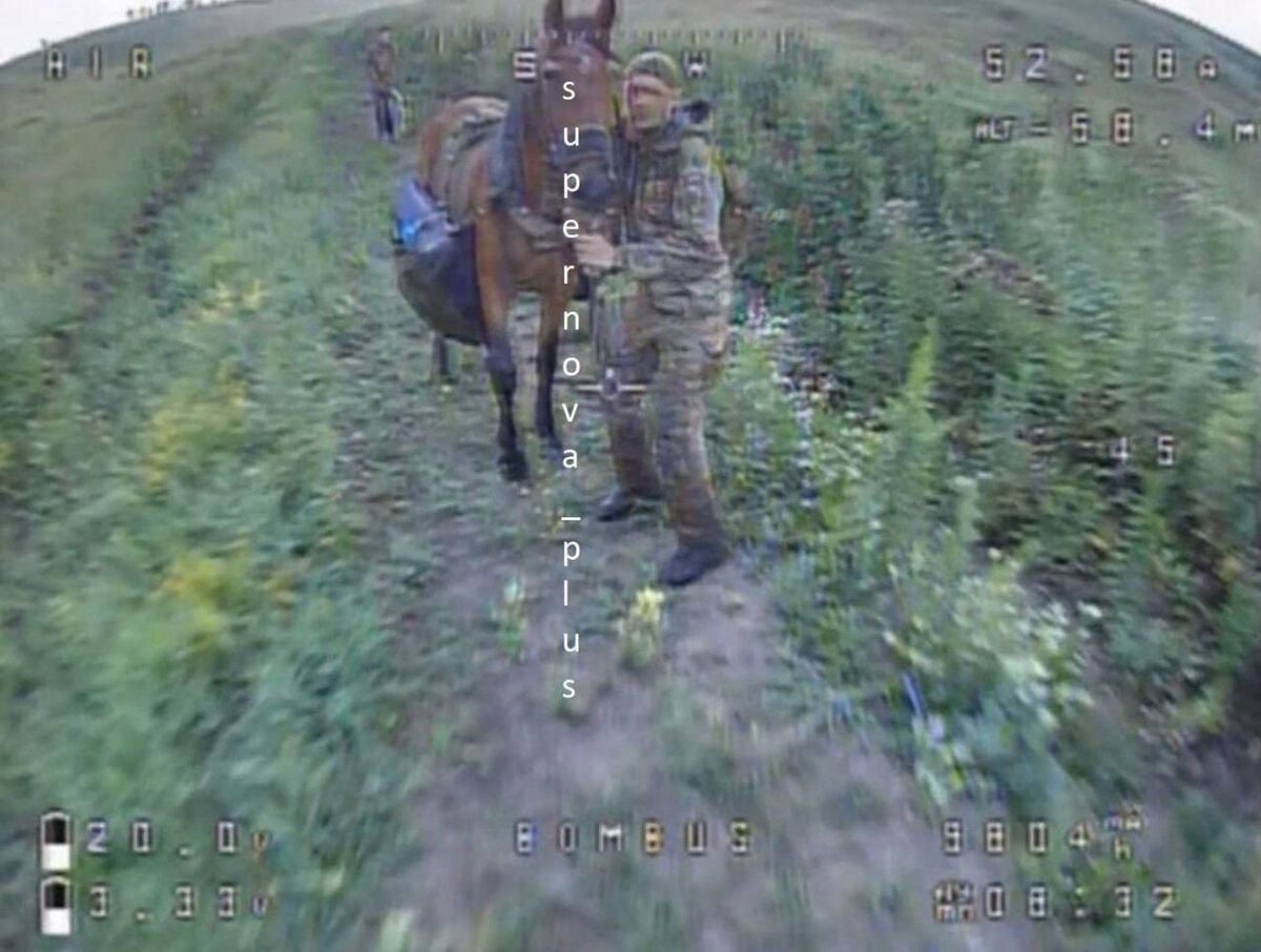 😡 Стопкадр с вражеского FPV-дрона, поражающего солдата армии России и его лошадь, используемую на фронте, как транспортное средство для