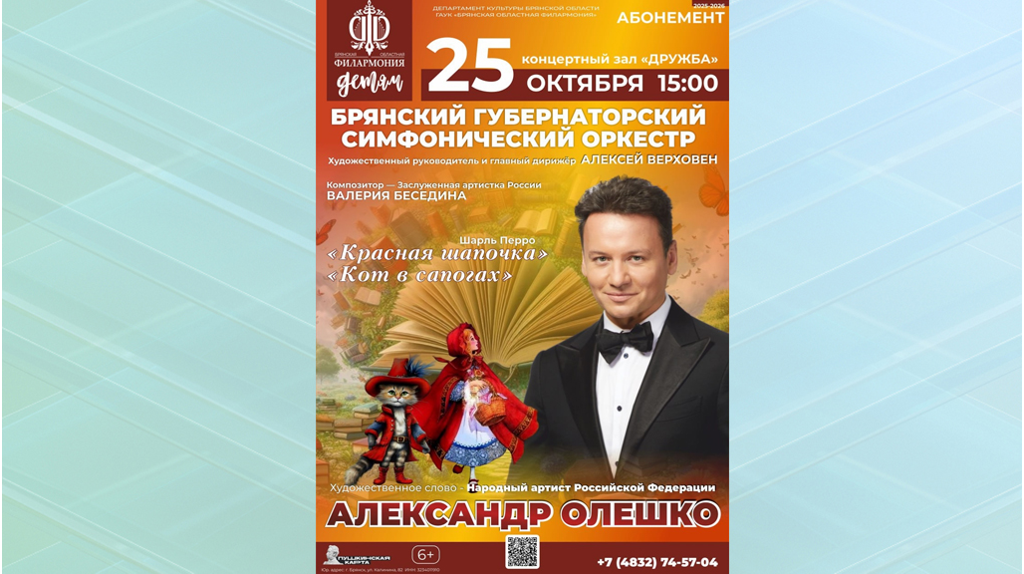 На сцене концертного зала "Дружба" состоится концерт, погружающий зрителей в атмосферу любимых сказок детства. Прозвучат Сюиты для симфонического оркестра «Кот в сапогах» и «Красная шапочка», написанные композитором Валерией Бесединой по мотивам классических произведений Шарля Перро. Эти музыкальные сказки оживут в исполнении Брянского Губернаторского симфонического оркестра под управлением художественного руководителя и главного дирижёра Алексея Верховена. Особое украшение вечера — участие Народного артиста Российской Федерации Александра Олешко, который выступит в роли чтеца. Его яркое, выразительное чтение придаст каждой истории живость, драматизм и неподдельную сказочную магию. Концерт состоится 25 октября. Начало в 15:00. Возрастная категория: 6+ В Брянске оживут любимые сказки детства
