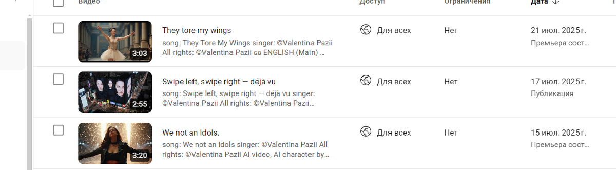 Languages: EN | RU | CN Всего пару дней назад вышел яркий и ироничный трек "Swipe left, swipe right — déjà vu" — гимн разочарованной романтики цифровой эпохи. Песня переносит слушателя от бесконечных свайпов в приложениях до мечты о любви на другой планете. Вдохновлённая эстетикой K-pop и визуальным сторителлингом, композиция соединяет танцевальный грув, юмор и искреннюю тоску по настоящим чувствам. ЯНДЕКС МУЗЫКА Swipe left, swipe right — déjà vu – Valentina Pazii “They Tore My Wings” “We Not an Idols” "Under the green light" Каждый из нас рождается уникальным, со своими талантами, способностями и мечтами. Но все мы сталкиваемся с давлением общества, близких и не очень людей, а также с собственными страхами и неудачами. В песне "They Tore My Wings" Valentina Pazii передаёт мощное послание: не сдаваться, идти к своей цели и взлететь вопреки всему. Эта композиция стала настоящим гимном силы воли и стремления. В новом клипе "We Not an Idols" Valentina P