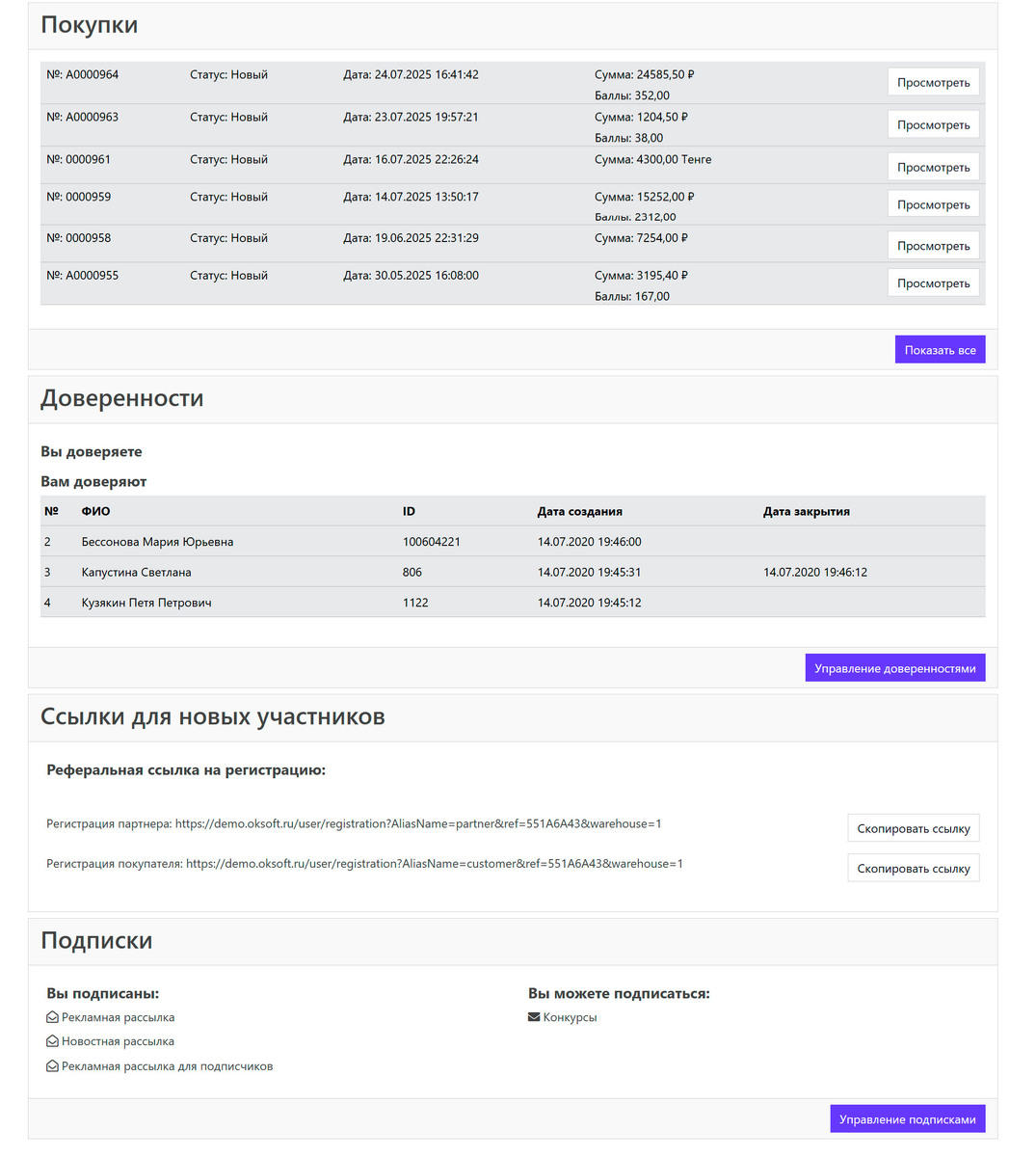 📊 Покупки, объемы в баллах, начисления по партнёрам.