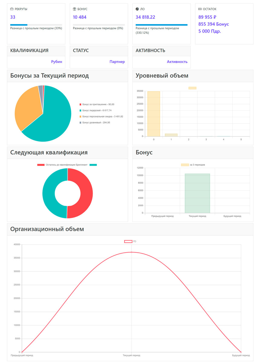 Разработка личного кабинета дистрибьютора начинается с удобной, информативной и наглядной главной страницы, на которой отображаются ключевые бизнес-показатели. Это позволяет партнёру в любой момент контролировать личную активность, наблюдать динамику роста и оперативно реагировать на изменения.