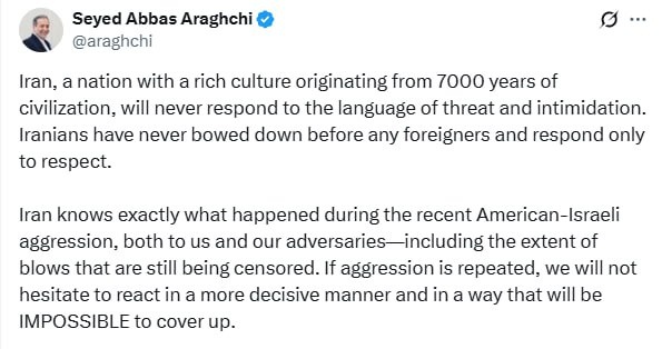 Iran will ‘NEVER’ respond to threats and intimidation – FM Araghchi
