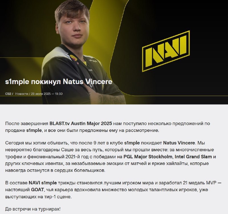 ⚡️Легенда уходит: s1mple покинул NAVI после 9 лет в составе Конец эпохи. После завершения BLAST.tv Austin Major 2025 NAVI официально объявили — Александр "s1mple" Костылев больше не часть команды. 9 лет, 21 MVP, титул лучшего игрока мира трижды. Победы на PGL Major Stockholm, Intel Grand Slam, сотни хайлайтов и миллионы сердец — всё это стало частью наследия Саши в NAVI. Руководство клуба поблагодарило s1mple за путь, который они прошли вместе: за победы, эмоции и ту самую магию, которую он приносил на сервер. GOAT ушёл — но оставил после себя целую эру. Ждём анонс следующей команды и, конечно, новых клатчей.... Подробнее: https://hard-tm.su/threads/104441/ 🕹HARD-TM — Подписаться
