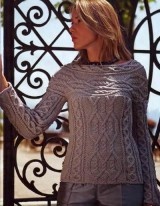 Размеры: 38 Вам потребуется: 600 г светло-серой пряжи Mondial Prima (100% мериносовой шерсти, 95 м/50г), прямые спицы № 4.5 и № 5; вспомогательная спица; штопальная игла Двойная резинка: контрастной нитью набрать половину требуемых петель. 1-й р.: рабочей нитью вязать * 1 лиц., 1 накид *. Повторять от * до *; 2-й р.: * провязать накид лиц., снять 1 п. как изн. , не провязывая, нить парад работой *, повторять от * до *; 3-й и последующие ряды: * 1 лиц., снять 1 п. как изн., нить перед работой, повторять от * до *; в готовой детали изнаночную нить распустить. Лицевая гладь: лиц. р. - лиц п., изн. Р. – изн. п. Основной узор (ширина 64 п.): вязать по схеме. В изн. р. петли вязать по рисунку. 43-й ряд: повторять раппорт с 3-го р. Плотность вязания, основной узор, спицы № 5; 23 п. и 26 р. - 10 х 10 см. Спинка/перед: на спицы № 4,5 набрать 84 п. и связать 6 р. (1 см) двойной резинкой. Перейти на спицы № 5 и вязать следующим образом: 10 п. лиц. гладью, 64 п. основным узором, 10 п. лиц. гладью