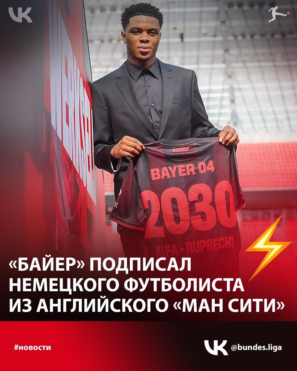 «Байер» купил у «Ман Сити» Альфа-Рупрехта за 1+ млн евро и бонусы 🔥 «Горожане» получат 40% от перепродажи вингера. 🇩🇪 Вингер молодежной сборной Германии выступал за команду «горожан» до 21 года. По данным Kicker, сумма трансфера составила чуть более одного миллиона евро. Соглашение также предусматривает значительные бонусы. Альфа-Рупрехт подписал контракт с «Байером», рассчитанный до 30 июня 2030 года.