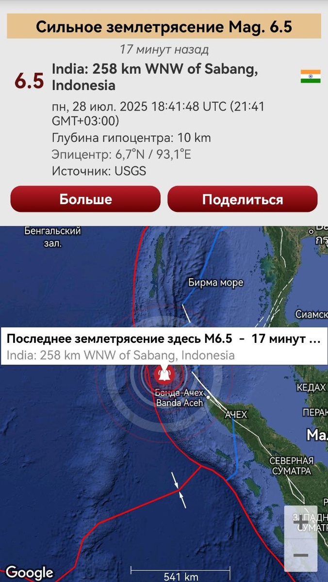 В ответ на пост По Андаманскому морю произошло ожидаемое землетрясение М6+, но проблема в том, что энергия этим событием сброшена не полностью. Возможна более сильная сейсмика (М7+...) в течение 7 дней. Недавно (25 июля) по зоне был замечен ОСТИ на М8+. ===== The expected M6+ earthquake has occurred in the Andaman Sea, but the energy has not been fully released by this event. Stronger seismic activity is possible (M7+...) within 7 days. Recently, a CSTI was observed in the zone for M8+ level.