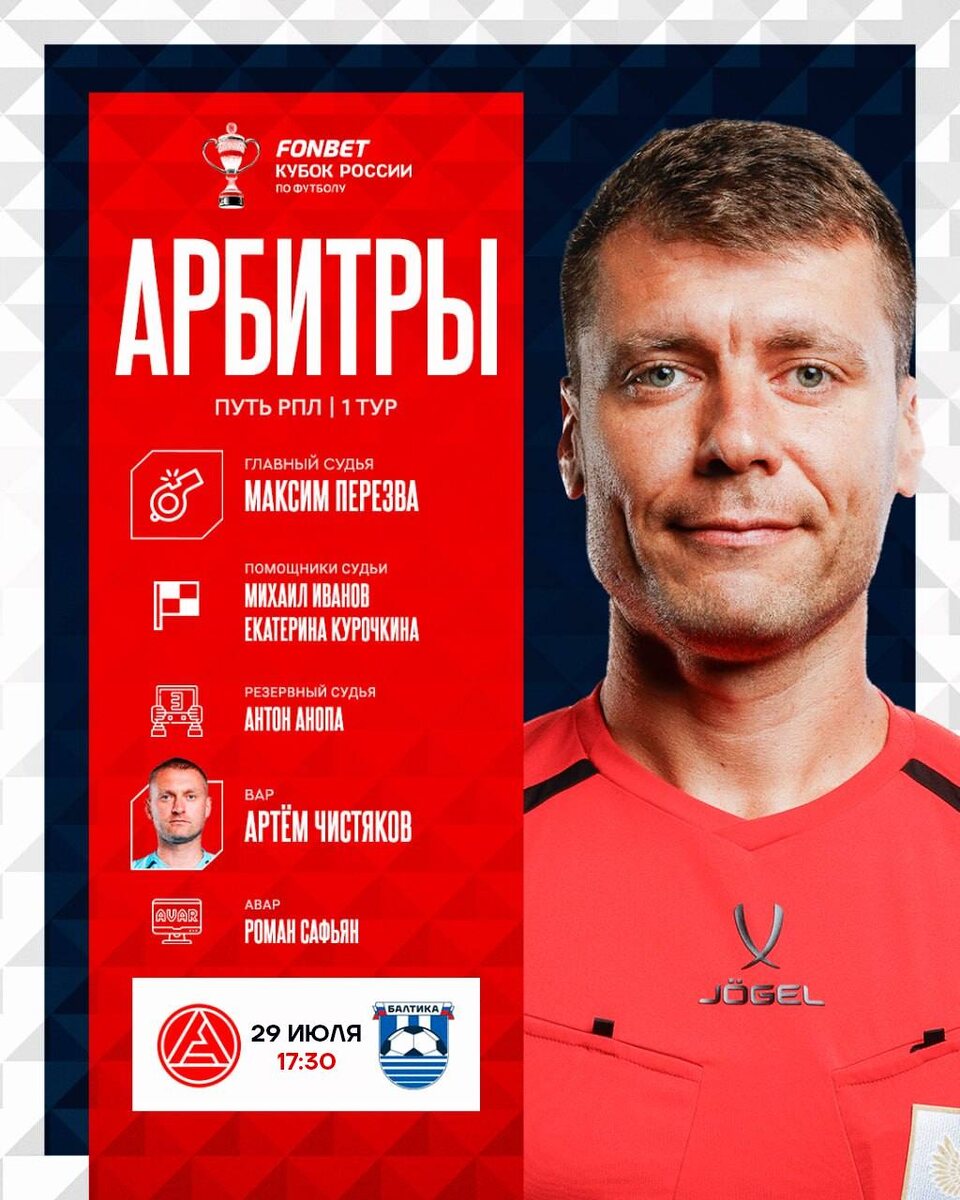 На матч первого тура группового этапа Пути РПЛ FONBET Кубка России назначена следующая бригада арбитров: 🚩 Главный арбитр матча — Максим Перезва 🏳 Ассистенты судьи — Михаил Иванов, Екатерина Курочкина 📺 VAR — Артём Чистяков 👀 AVAR — Роман Сафьян ✍🏻 Инспектор – Сергей Мацюра В качестве главного судьи Максим Валерьевич работал на четырех матчах «Балтики», в которых наша команда единожды одержала победу и три раза сыграла вничью. В этих встречах было показано пять желтых карточек.