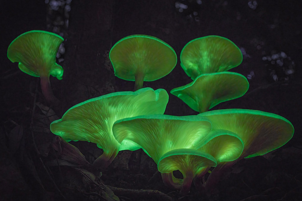 Привет, мои дорогие любители необычной земной природы. Сегодня мы отправимся в лес. Но не за ягодами и не по грибы, а к тем, кто светится в темноте. Их не видно днём, зато ночью — они превращают мёртвую древесину в портал в иной мир. Особенно если знаешь, куда смотреть. Поставь палатку в лиственном лесу на юге США. Дождись темноты. Смотри под ноги — и вдруг заметишь зелёное сияние. Это не мох и не плесень. Это грибы. Их плодовое тело кажется обычным, даже скучным, но то, что скрыто — видно только в темноте. Именно этим и славится наш сегодняшний герой. Познакомьтесь: Omphalotus subilludens — биолюминесцентный гриб из рода Omphalotus. Русского названия у него нет, но его сияние в природе — хорошо задокументированное чудо. Обнаружить его можно в восточных и южных штатах США, от Каролины до Техаса. Этот гриб растёт на мёртвой древесине, чаще всего на дубе. Он любит тень, влагу и тихие леса, где почти не ступает нога человека. Его плодовое тело — воронковидное, с охряно-оранжевой шляпкой д