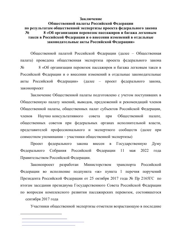 Заключение Общественной палаты Российской Федерации по результатам общественной экспертизы проекта федерального закона № 121564-8 «Об организации перевозок пассажиров и багажа легковым такси в Российской Федерации и о внесении изменений в отдельные законодательные акты Российской Федерации»