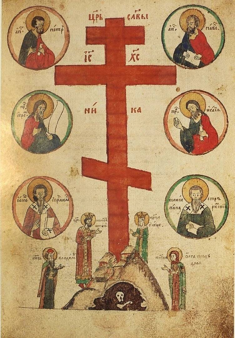 Крест с изображением князя Владимира и княгини Ольги. Евангелие, XVI в. РГБ, Ф.98, №1051