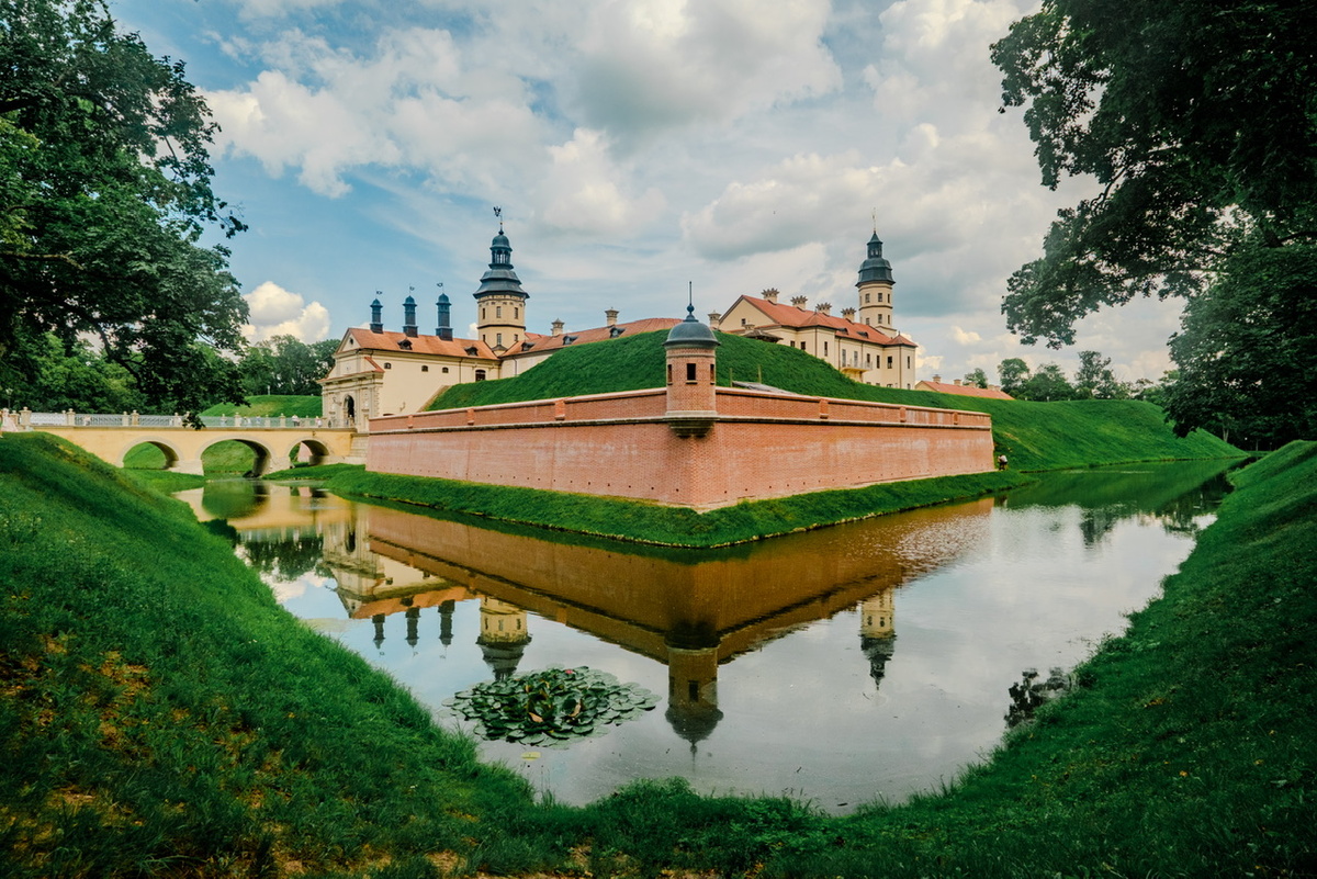 Представьте себе: вы едете по белорусской дороге, за окном то и дело мелькают деревни с аккуратными домами, аккуратно подстриженные поля и вдруг перед вами вырастает настоящий замок. Не в Германии, где ему самое место, а прямо здесь, в этой самой Беларуси, о которой часто мы мыслим стереотипами. Естественно, готовясь к поездке, я выделил для себя целых два замка недалеко от Минска, которые сегодня являются чуть ли не главными туристическими объектами страны. В первую очередь я поехал в Несвижский замок, который окружен густой парковой зоной. Подъехать к замку вплотную можно, но это будет стоить 7 белорусских рублей за стоянку. Хитрые туристы тут же организовали собственную стоянку в поле, недалеко от главных ворот. До самого замка путь идет через красивейший парк, где деревья растут уже очень давно. И вот он - красавец замок. Беларусы действительно любят свою историю. Замок не просто стоит - он сияет. Отреставрированные стены, ухоженные клумбы, все в таком состоянии, как будто это стро
