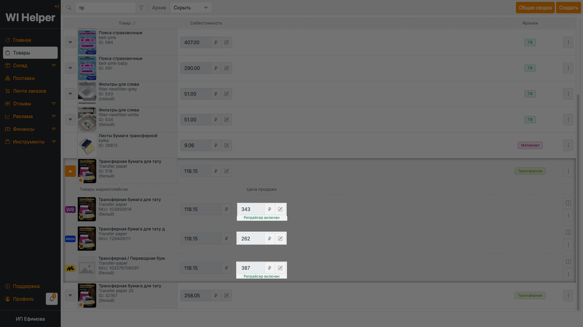 Благодаря инструменту "Ценообразование" можно устанавливать цену и скидку на товары, учитывая ряд расходов, которые вычисляются автоматически. Данный инструмент расположен в разделе "Товары" внутри карточки любого маркетплейса. Нажав на иконку редактирования откроется диалоговое окно с "Ценообразованием". Данные о цене за логистику каждого склада и ценах на хранение товара автоматически подгружаются из маркетплейсов Wildberries, Ozon и Яндекс Маркет и обновляются регулярно, чтобы пользователи всегда могли оперировать самыми актуальными значениями. Это значительно упрощает процесс управления ценами Ниже представлены примеры инструмента с разными маркетплейсами. Ozon Яндекс Маркет Для того чтобы изменить цену нажмите на значок редактирования. Все это осуществляется через официальное API, что обеспечивает безопасность и надежность процесса.