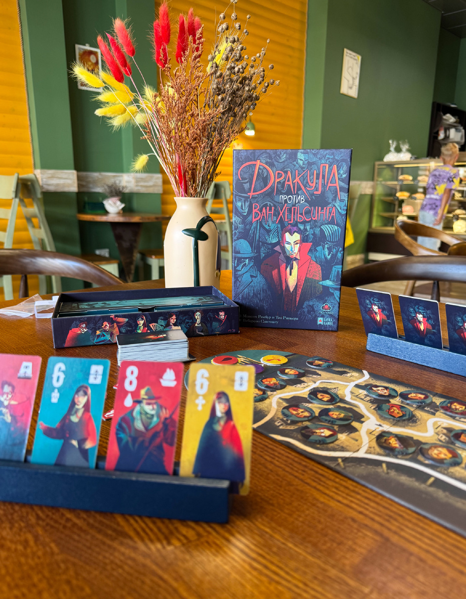 Мне очень нравится, как оформляет игры Веберсон Сантьяго, и эта настолка не исключение: это просто крайне крутая собственная художественная манера и стиль! Ну и продакшен с гробиком в контексте ложемента и деревянные подставками под карты, которые не карты, а по-хорошему тайлы, отдельно хочется отметить. Единственное, что вызывает беспокойство, — из-за того, что это действительно тайлы, в протекторы их не убрать, а для такой игры очень важна «конфиденциальность» лицевой стороны карты для соперника, и есть опасения, что со временем появятся потёртости, которые позволят отличить один тайл от другого, что для такого геймплея, как в «Дракуле», довольно критично. Но пока мы наиграли всего ничего, и игра, хвала богам, выглядит как новенькая:)