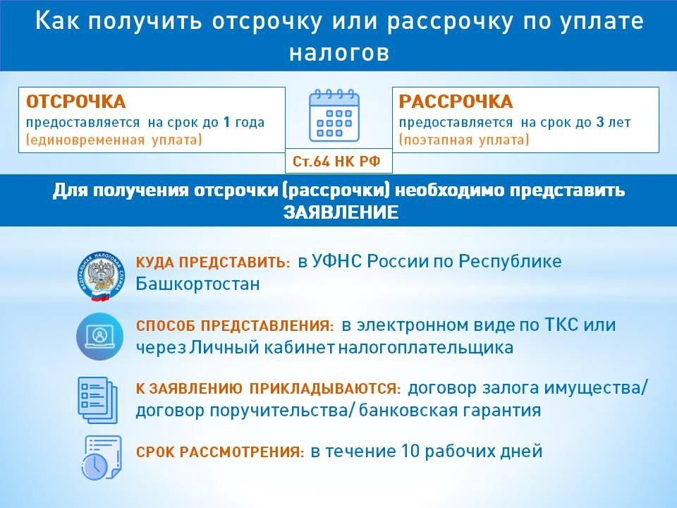 Отсрочка или рассрочка — возможность заплатить налоги или долг по ним позже срока или частями. Подробнее как получить отсрочку или рассрочку по налогам смотрите в наших карточках Межрайонная ИФНС России 4 по Республике Башкортостан Источник https://uchaly102.ru/?p=93662