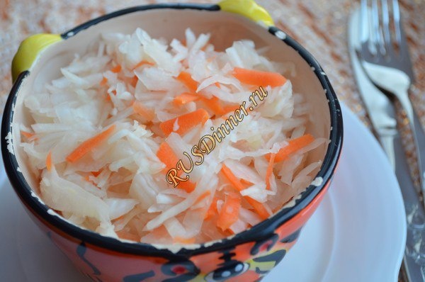 Маринованная капуста Ингредиенты: Капуста белокочанная - 2000 гр. Морковь - 300 гр. Чеснок - 3 зуб. Для маринада: Семена укропа - 2 гр. (щепотка) Вода - 1000 мл. Масло растительное - 20 мл. (1 ст. л.) Соль - 90 гр. (3 ст. л.) Сахар - 135 гр. (3/4 ст.) Уксусная кислота 70 процентная - 18 мл. (1 ст. л.) Источник: https://rusdinner.ru/page/marinovannaja-kapusta