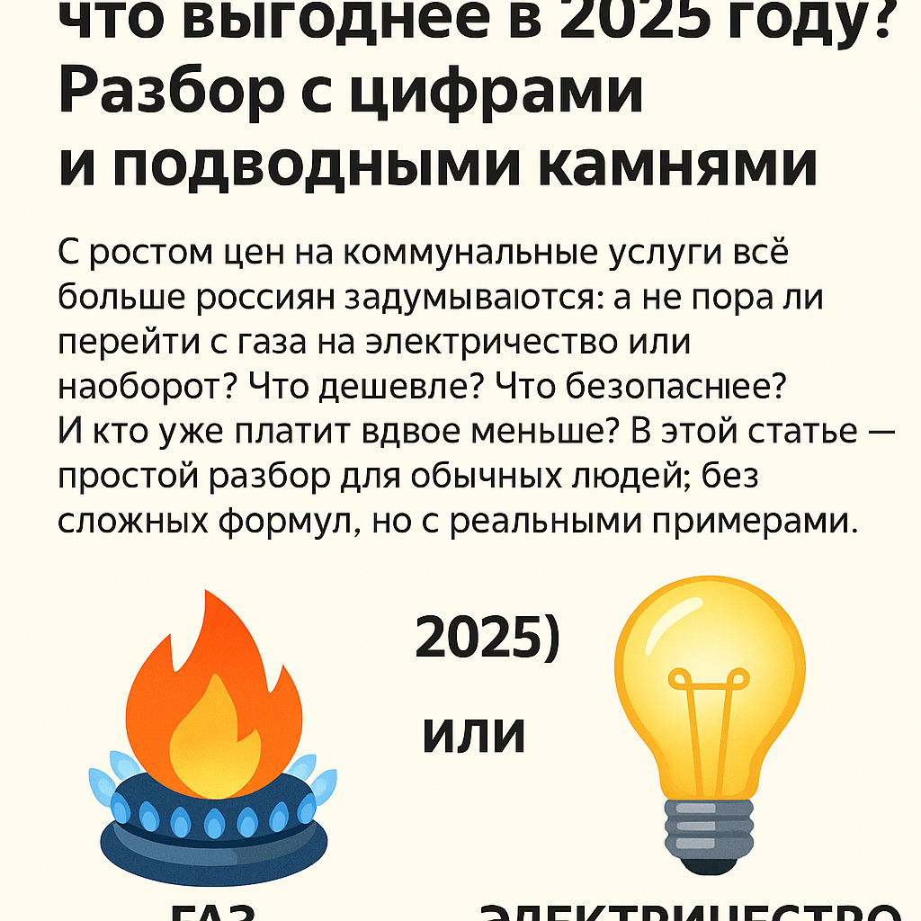 Заголовок: 🔥 "Газ или электричество: что выгоднее в 2025 году? Разбор с цифрами и подводными камнями" Вступление: С ростом цен на коммунальные услуги всё больше россиян задумываются: а не пора ли перейти с газа на электричество или наоборот? Что дешевле? Что безопаснее? И кто уже платит вдвое меньше? В этой статье — простой разбор для обычных людей: без сложных формул, но с реальными примерами. Основные блоки статьи: 1. 💰 Цены на газ и электричество в 2025 году Сравнение тарифов: по регионам, по типу потребителей. Примеры: семья из 3 человек в квартире и дом с газовым отоплением. 2. 🔧 Установка и обслуживание Сколько стоит подключение газа/электричества. Скрытые расходы: техническое обслуживание, замена оборудования. 3. 🔥 Безопасность и надёжность Частые аварии: что опаснее — утечка газа или перегрузка сети? Как защитить себя: датчики, вентиляция, УЗО. 4. 🌱 Экология Что чище: сжигание газа или выработка электричества в России. Как повлияет на ваш выбор будущее