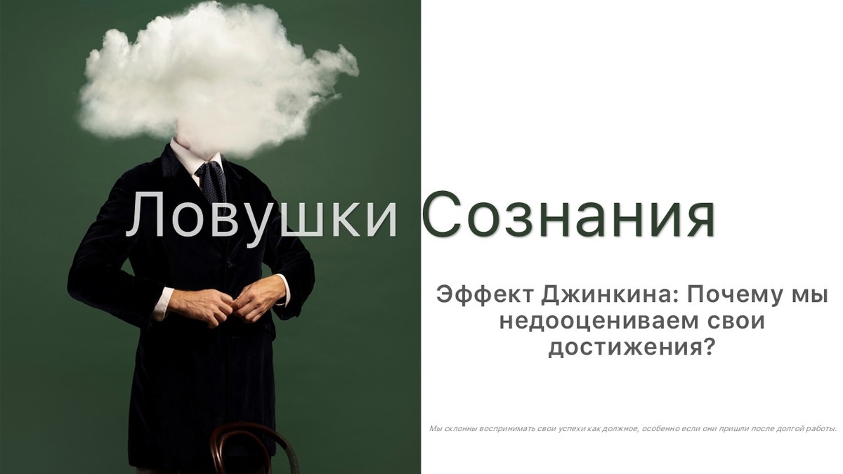 Привет, друзья! Сегодня на канале «Ловушки Сознания» поговорим об эффекте Джинкина — явлении, которое объясняет, почему мы склонны игнорировать свои успехи, даже если они очевидны для окружающих. Знакомо чувство, когда вы достигаете чего-то важного, но вместо радости думаете: "Это и так должно было получиться"? Давайте разберёмся, как это работает. Представьте ситуацию: вы успешно завершили сложный проект, и коллеги хвалят вас. Но вы отвечаете: "Да это же было не так уж и сложно", или "Просто повезло". На самом деле, вы вложили в это много усилий, но ваш мозг отказывается признавать вашу заслугу. Это и есть эффект Джинкина. Он заключается в том, что мы склонны преуменьшать свои достижения, списывая их на удачу, обстоятельства или внешние факторы. Мы воспринимаем успех как нечто естественное, а не как результат своих усилий. Этот феномен был исследован психологом Элизабет Джинкин, которая изучала, как люди оценивают свои успехи. В своей работе "The Psychology of Undervalued Success" («П