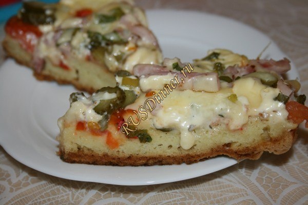 Пицца на сковороде От автора: "Пицца на сковороде" не похожа на обычную пиццу, она скорее всего напоминает большой бутерброд. Ингредиенты: Сметана - 150 мл. Майонез - 150 гр. Яйцо - 2 шт. Мука - 300 гр. Перец болгарский - 250 гр. Помидоры - 150 гр. Лук зелень - 1 пуч. Сыр - 100 гр. Приправа для пиццы - 10 гр. Масло растительное - 25 мл. Огурцы консервированные - 100 гр. Источник: https://rusdinner.ru/page/picca-na-skovorode