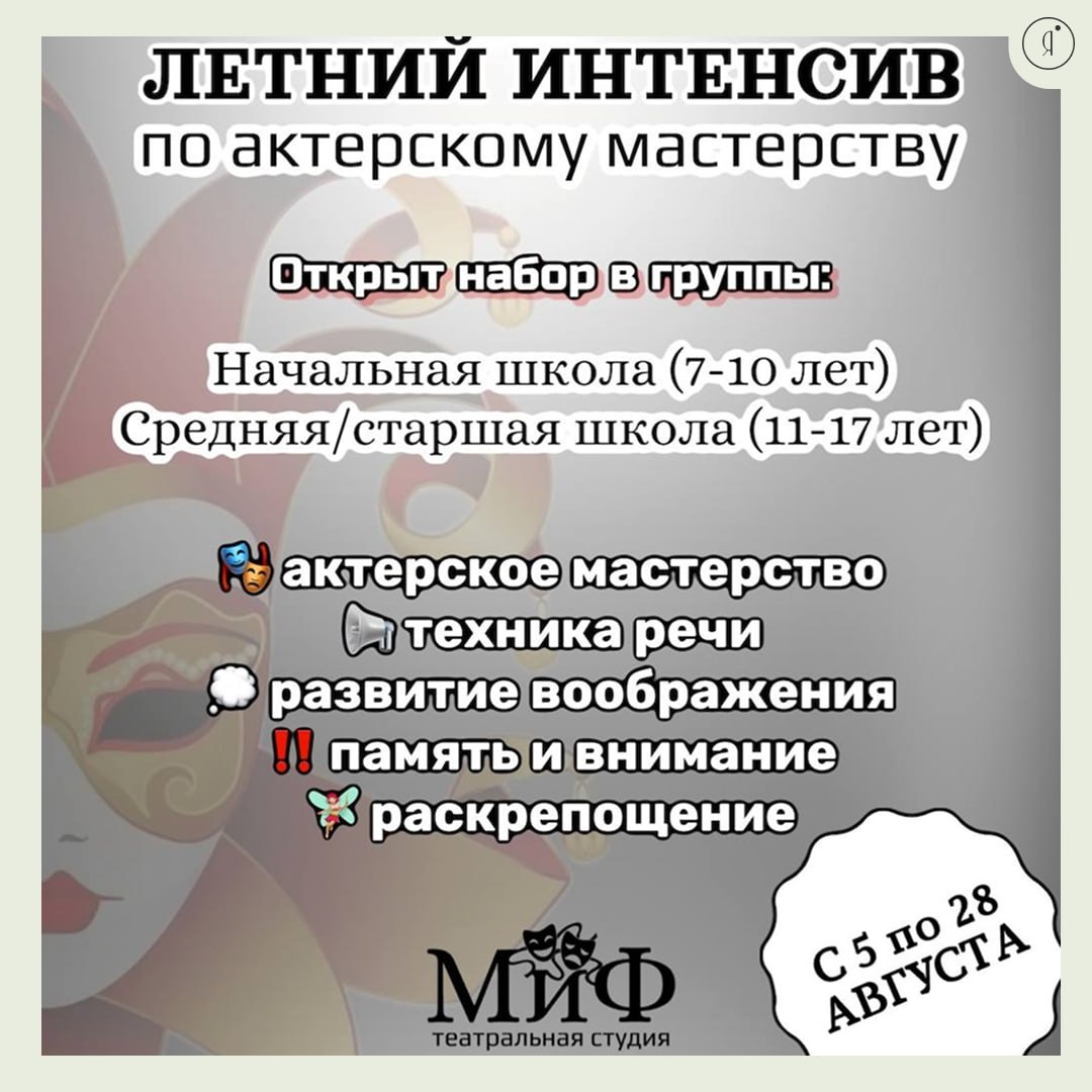 Интенсив по актерскому мастерству #МК #Детям #ЛетнийЛагерь Интенсив направлен на раскрытие различных творческих способностей ребёнка: 🤩 актерское мастерство 🤩 техника речи 🤩 пластика тела 🤩 выразительное чтение 🤩 снятие зажимов 🤩 раскрепощение 🤩 участие в отчетной постановке 5-28 августа Пр. Ленина, 42 Начальная школа (7-10 лет) ВТ, СР, ЧТ | 14:30-15:30 Средняя/Старшая школа (11-17 лет) ВТ, СР, ЧТ | 16:00-18:00 Бесплатное пробное занятие 12 занятий - 6000₽ (500₽/занятие) +79659965965 Online Якутия | Подписаться