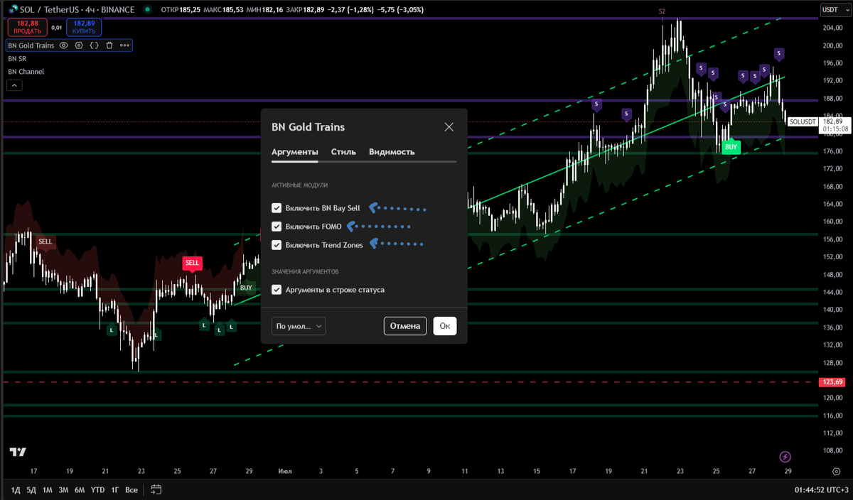 Хотите входить в рынок без колебаний, получая только надёжные сигналы и избегая неопределённости? Представляем вам BN Gold Trains – уникальный многофункциональный индикатор для TradingView, созданный специально для уверенных и прибыльных сделок! ✨ Три эффективных модуля, которые сделают вашу торговлю успешной: Этот модуль точно показывает моменты для открытия и закрытия сделок (BUY/SELL), отфильтрованные по направлению тренда. Теперь вы будете уверенно избегать ложных входов и получать чёткие сигналы для стабильных и доходных операций. Модуль определяет мощные импульсные движения, используя уникальный авторский RSI, который учитывает объёмы и ATR. BN FOMO не реагирует на мелкие шумы, фиксируя лишь движения с аномально высоким объёмом и отображая силу импульса от уровней L1 до L4 (для лонга) и S1 до S4 (для шорта). Будьте впереди других трейдеров, входя в самые перспективные движения! Следите за трендом максимально удобно — при смене рыночного направления на графике автоматически появля