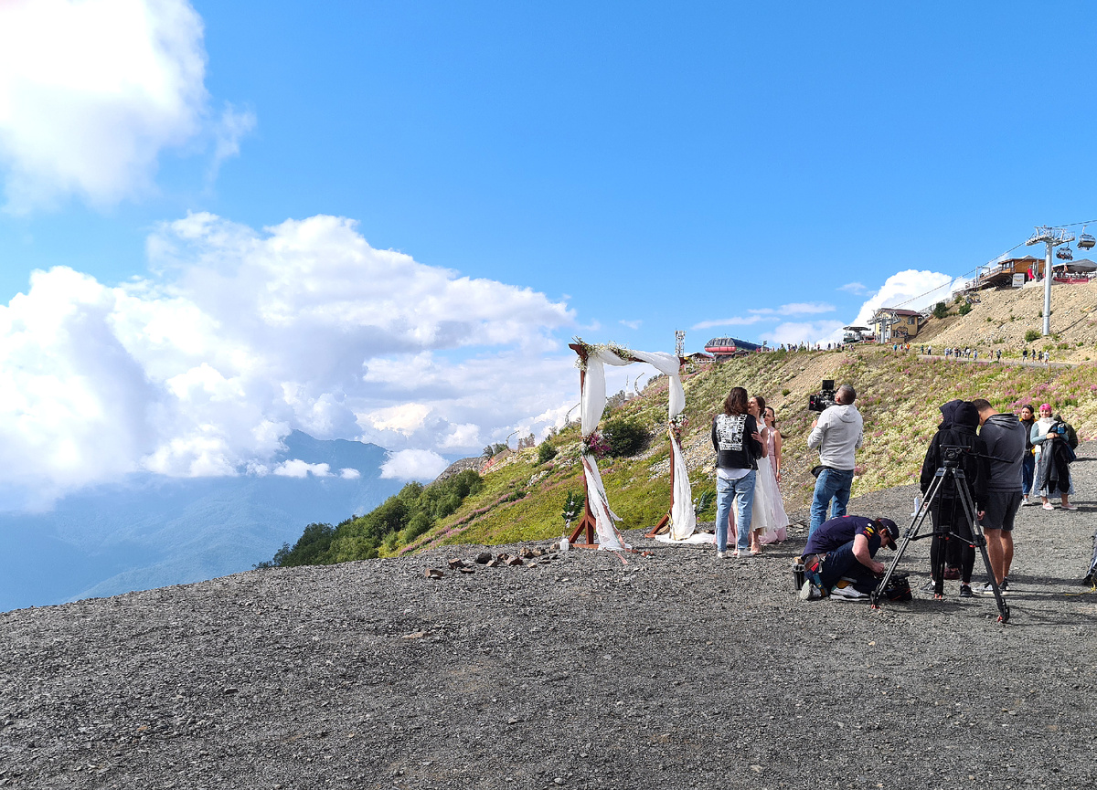 В самом начале пути мы увидели романтическую свадьбу на вершине. Кроме всего прочего, отсутствие официоза позволило жениху выглядеть вполне неформально. Правда, невеста всё равно добралась в свадебном платье. Но Анна выразила сомнение в том, что это настоящая свадьба, а не съемки какого-то фильма.
