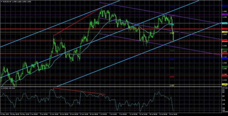 https://basechop.ru/wordpress/?p=51425 Валютная пара EUR/USD на 4-часовом ТФ в понедельник резко развернулась вниз и показала мощное падение. Это движение, с нашей точки зрения, очень интересное и о многом говорит. Давайте разбираться. Итак, Дональд Трамп в понедельник ночью объявил о подписании торгового соглашения между ЕС и США на пару с Урсулой фон дер Ляйен, главой Еврокомиссии. Ключевые пункты соглашения: 1)Европейский импорт в США будет облагаться ставкой 15%. 2)Европейский союз обязуется инвестировать в американскую экономику 600 млрд долларов. 3)Евросоюз обязуется закупать у США военную технику. 4)Евросоюз обязуется закупать энергоносители в США на сумму 750 млрд долларов. Сразу же возникает вопрос, а что обязуются сделать США? Этот вопрос останется без ответа. Либо в официальные СМИ не попала информация об обязательствах США, либо же их попросту нет. Снимаем шляпу – Дональд Трамп действительно подписал выгодное во всех отношениях соглашение для Америки. А Евросоюз… что