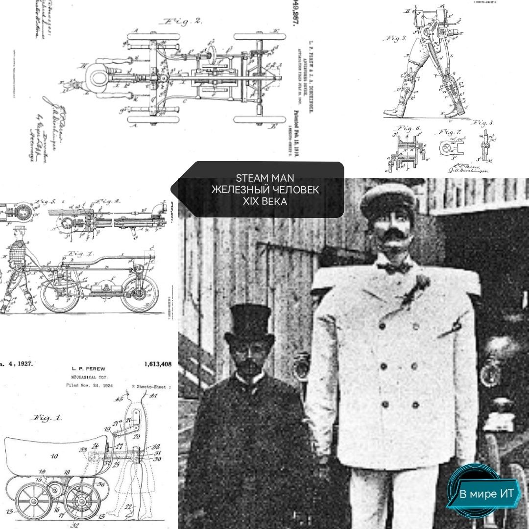 ЖЕЛЕЗНЫЙ ЧЕЛОВЕК XIX ВЕКА STEAM MAN | 🚶♂️🔥 На фото и чертежах — знаменитый Steam Man (Паровой человек), изобретённый американским инженером Задоком Дедериком в 1868 году. Это одна из первых попыток создать механического робота, способного ходить на двух ногах, используя паровой двигатель. Дедерик получил патент на своё изобретение, где подробно описал механизм: железный каркас, паровой двигатель мощностью 4 л.с., сложная система кривошипов, винтов и пружин для движения ног. Высота Steam Man - около 2,4 м, вес - 227 кг. Робот делал шаги длиной до 76 см и тянул повозку с пассажирами. Задок Дедерик был молодым и амбициозным механиком из Ньюарка, штат Нью-Джерси. Steam Man быстро стал сенсацией, демонстрировался на ярмарках и вдохновлял писателей на создание приключенческих романов о «железных людях». Steam Man был действующей моделью, но очень шумной, медленной и требовал постоянного обслуживания. Прототип был единственным. Идея парового антропоида стала основой для роботов. #вмиреит